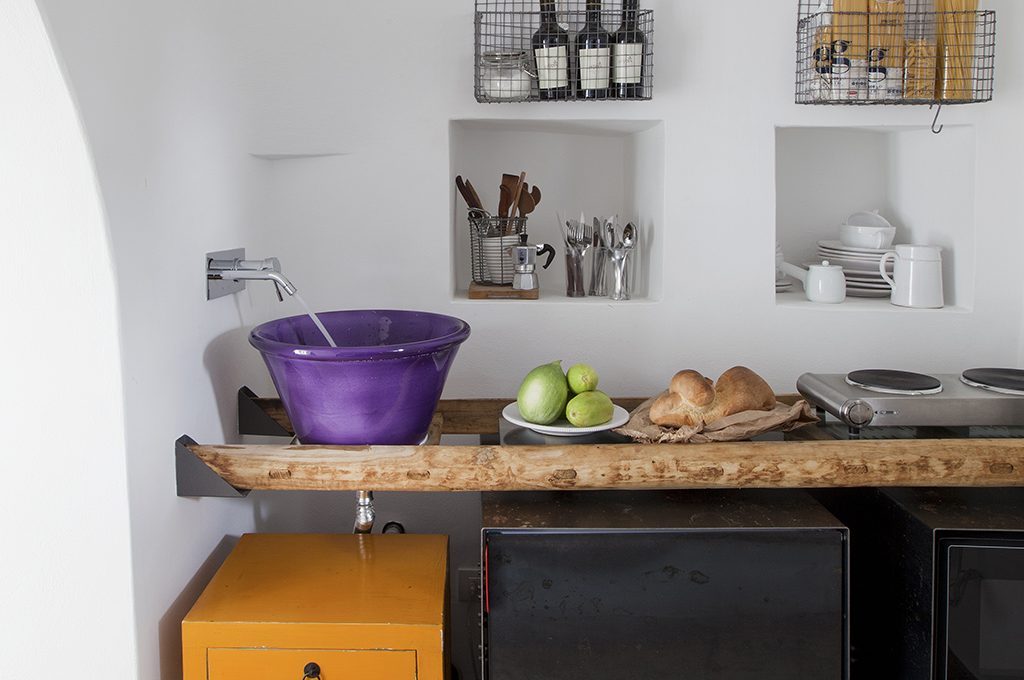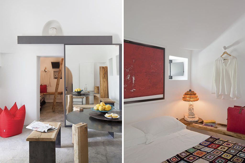 Le pietre originali usate per la copertura dei coni si accompagnano al cemento dei pavimenti, mentre mobili e accessori in legno massello sono accostati a pezzi moderni.