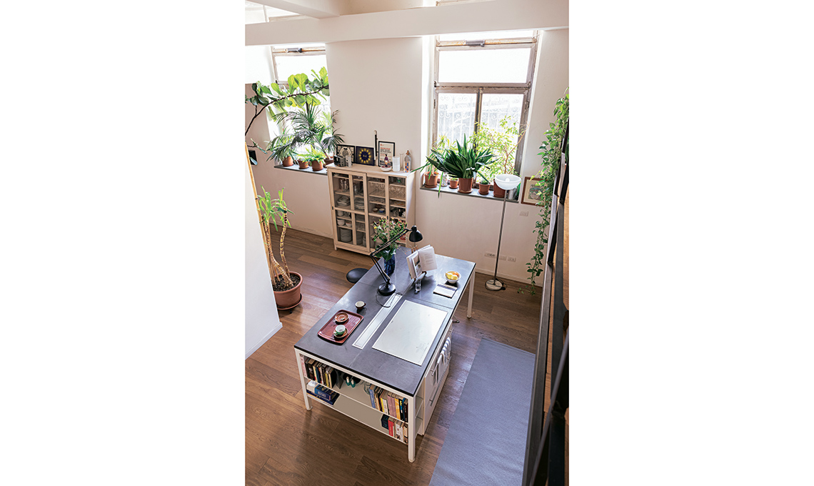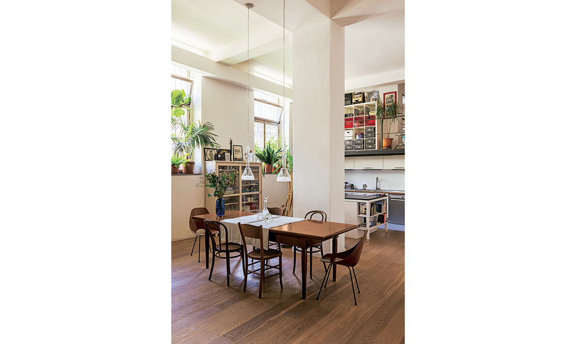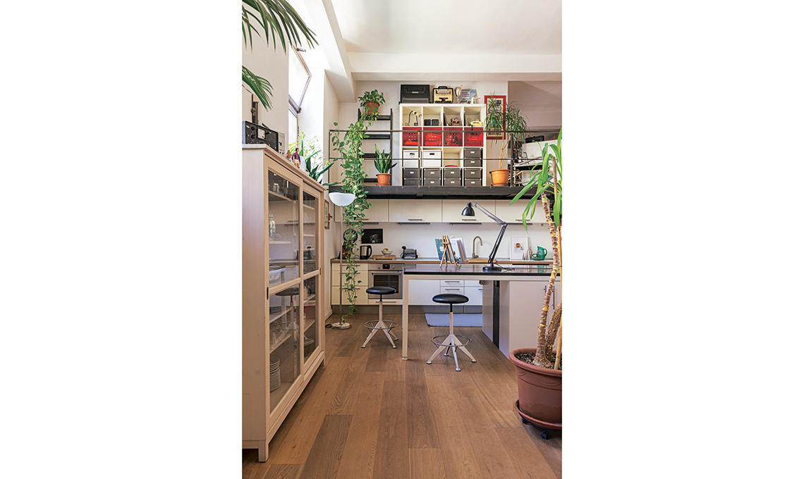 Adibito anche a location per eventi e spot pubblicitari, allo studio si aggiungono cucina e stanza da letto. Sopra il tavolo, sospensioni [Produzione Privata] non più a catalogo.