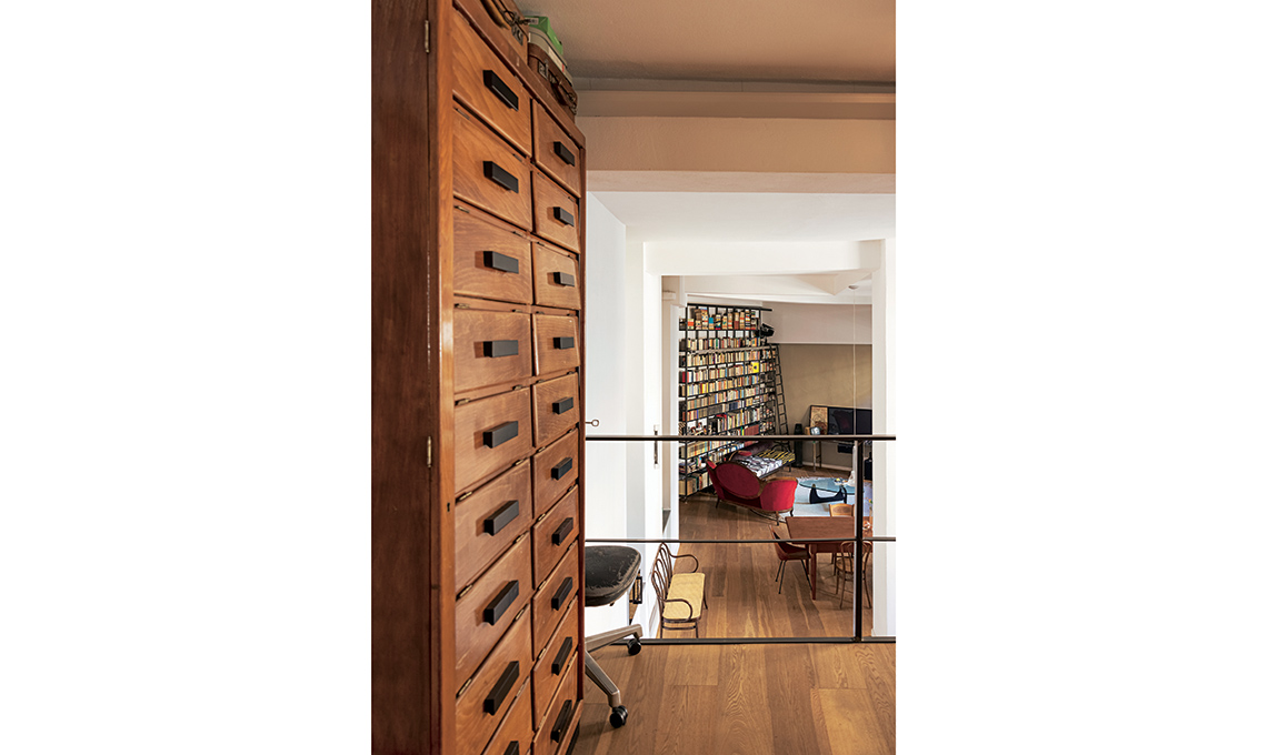 L’architetto Lula Ferrari ha mantenuto il sapore industriale della struttura progettando in ferro sia il soppalco sia la libreria dove