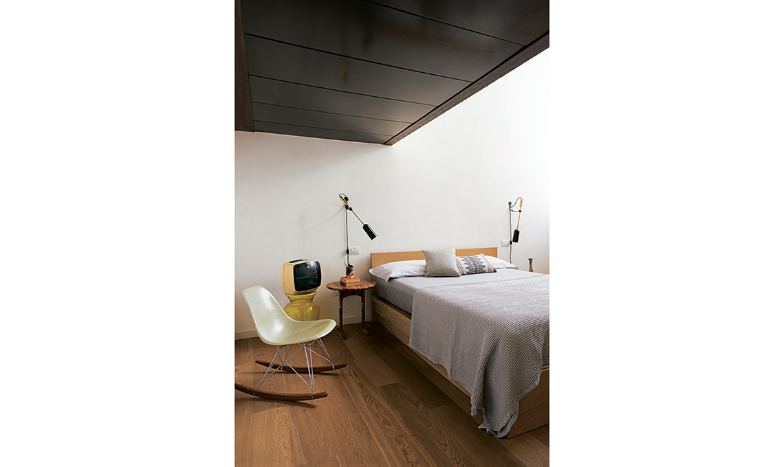 Per il regista Ranuccio Sodi questo spazio è la continuazione della sua esperienza lavorativa: trovi apparecchi hi-fi vintage, tv a tubo catodico. Sedia a dondolo vintage ispirata alla Eames Plastic Armchair RAR di [Vitra].