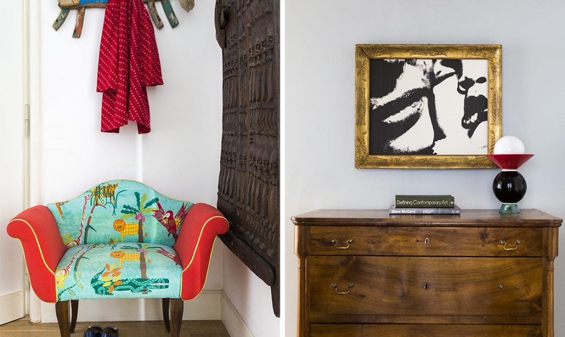 Il comò antico è un regalo di famiglia, trova posto nell’ingresso di casa insieme alla poltrona che la proprietaria ha fatto rivestire con un tessuto a disegni naïf e colori smaglianti.