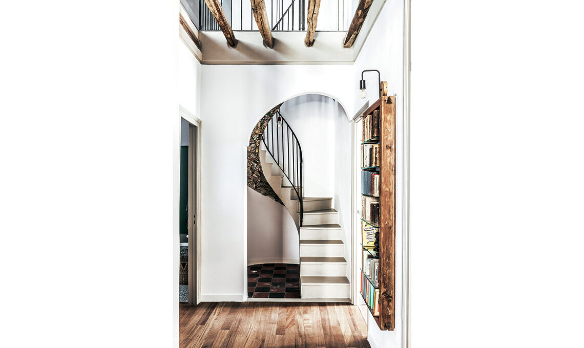 Il corridoio che conduceva verso i locali per il personale di servizio è stato aperto e modificato aumentando l’altezza (e l’illuminazione) dei soffitti. Se gli spazi e le pareti lo permettono, un’idea valida per amplificare il passaggio della luce naturale, anche in un corridoio, è aprire un ‘vano’ da arredare con mensole.
