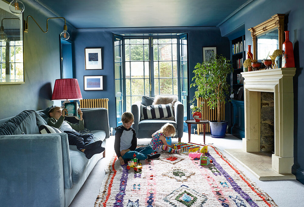 Pittura murale Light Blue e Oval Room [Farrow&Ball]. Tappeto marocchino ‘Boucharouite’: simile su benuta.it
