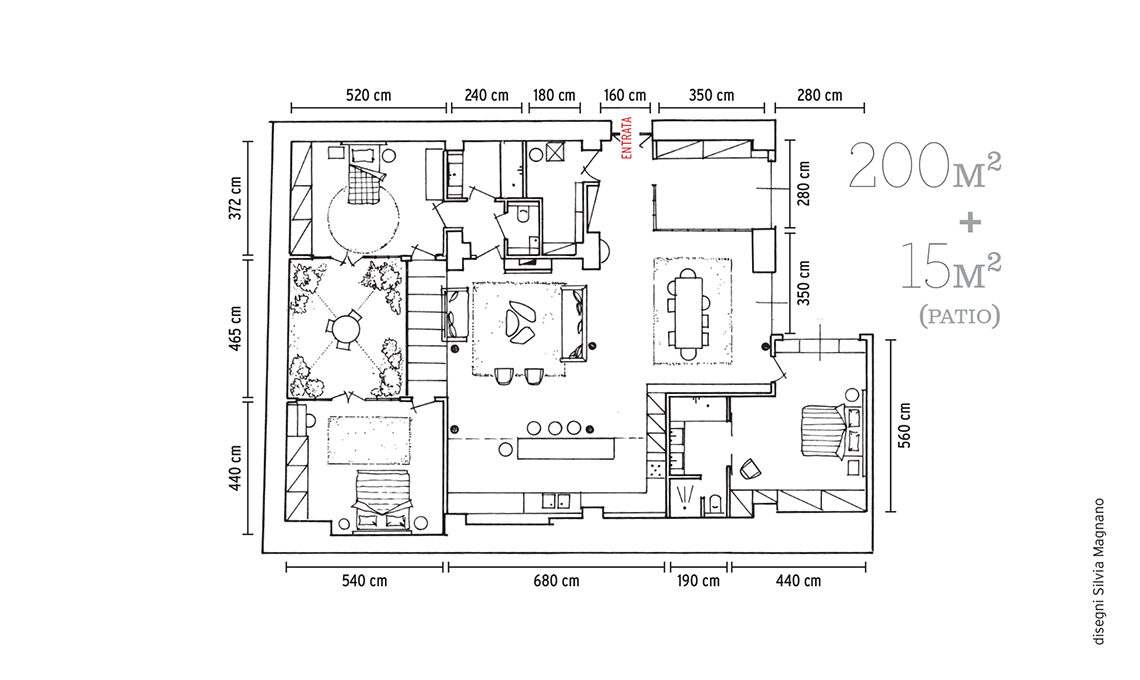Il giardino in casa! L’interazione fra interni ed esterni avviene anche nella zona notte, dove sono state ritagliate delle enormi portefinestre in ferro, dai profili sottili e leggermente lavorati.