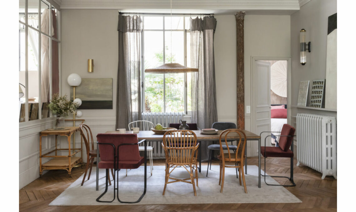 Mix di sedie [House Doctor], [Thonet], [House of Sakk]. Tenda [Caravane], tappeti [Toulemonde Bochart], lampada da terra La Prudente [Desjeux Delaye MR Editions].