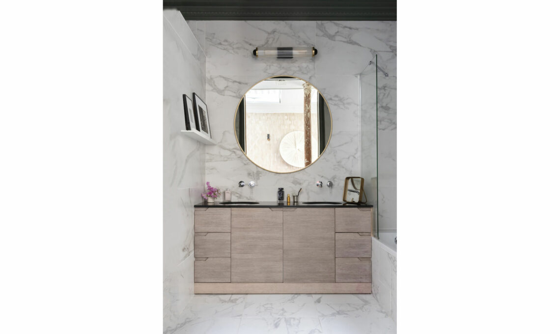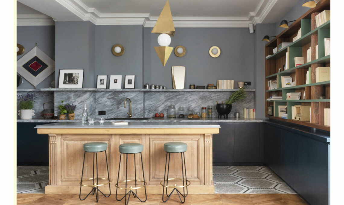La cucina progettata da Dorothée ha almeno tre punti forti da replicare: l’isola è un bancone in legno naturale che richiama quelli dei caffè parigini di una volta, con modanature e pannelli bugnati. Un pezzo ’sartoriale’ che non risulta pesante se accostato ad ante senza maniglie. Punto due: il marmo che da piano diventa alzata e poi mensola. Tre: la libreria che si integra alla cucina e la rende un luogo ’elegante’ tanto quanto il salotto o la sala da pranzo. Geniale, no?