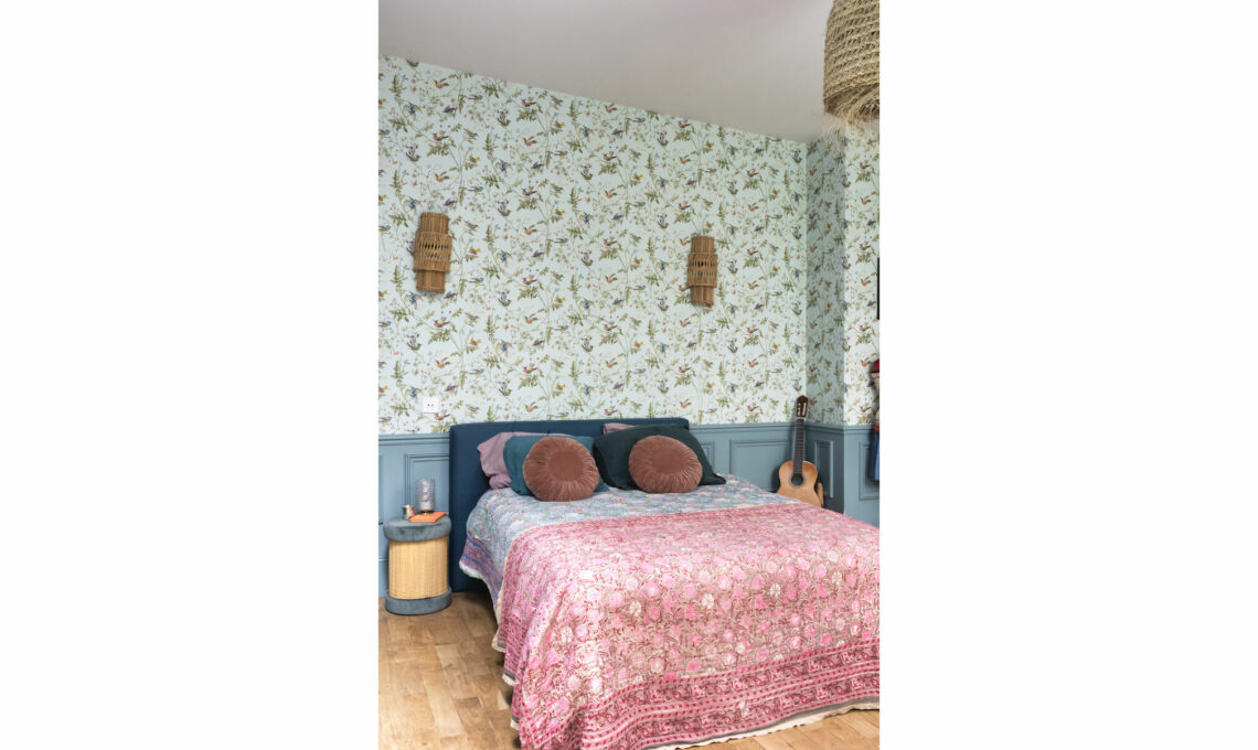 Nella camera di Faustine la scelta della wallpaper è ricaduta suun genere floreale, con fiori e uccellini che fanno eco alla visuale del patio. Wallpaper Hummingbirds [Cole&Son], applique e lampadario [Rock The Kasbah].