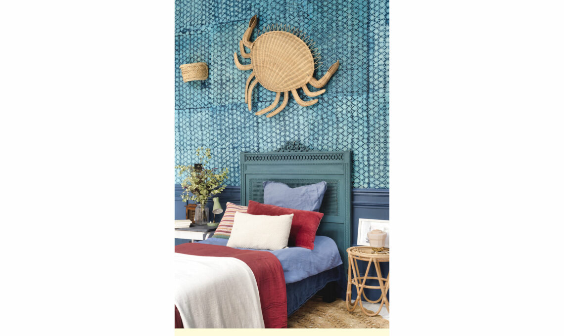 Pittura blu Wood 251 [Little Greene], wallpaper [Le Monde Sauvage], applique [Rock The Kasbah], granchio in rattan