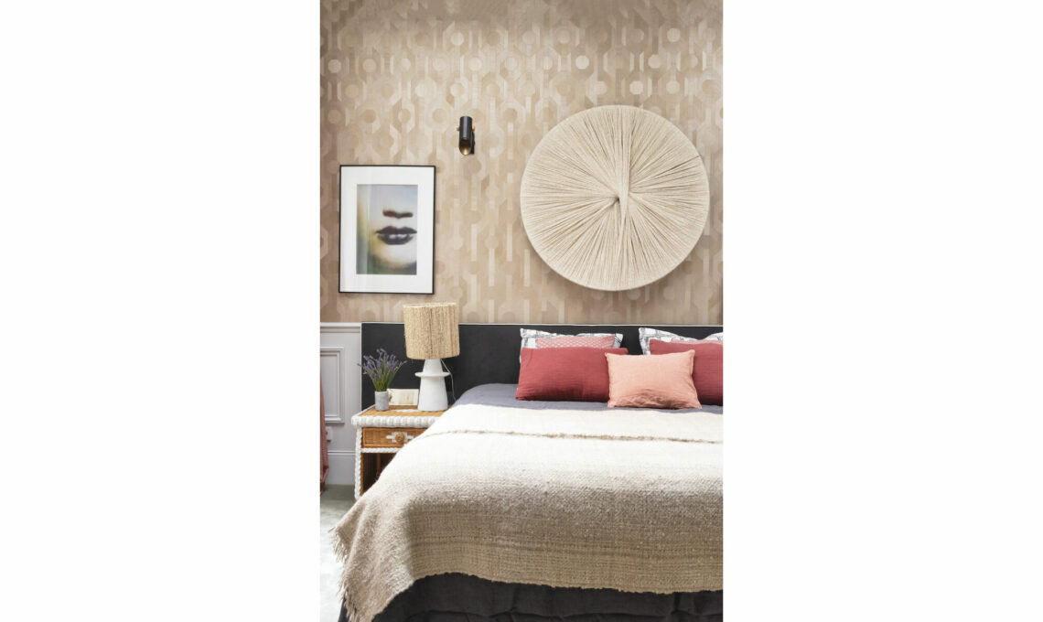 Wallpaper coll. Oculaire pattern Metric [Arte International], comodino in rattan [Selency], applique Tuboulon [Daniel Gallo], lampada da tavolo [Rock The Kasbah].
