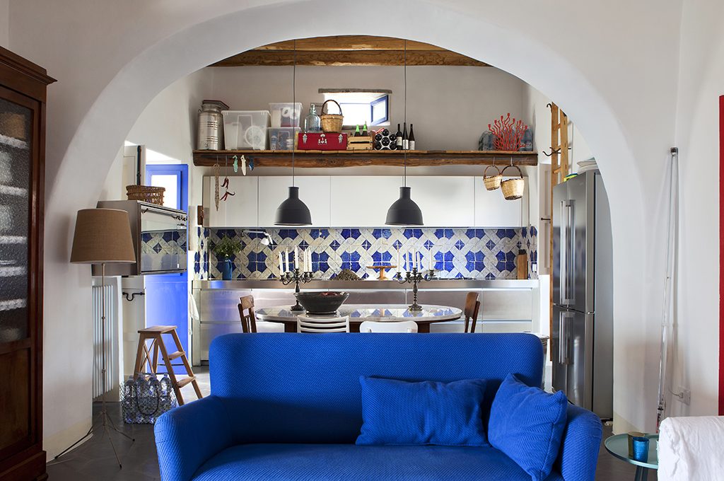 Nell'ampio spazio giorno, l'arco - la linea più tipica di tutto il Mediterraneo - incornicia la zona cucina e il living.