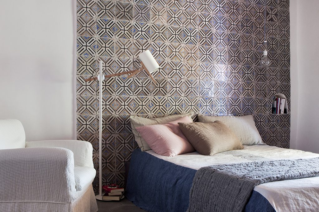 Il cuore della casa è all'esterno, sotto il grande 'bagghiu', il porticato coperto da canne con pavimenti in cemento e pareti di calce bianca, ma i colori blu e bianco proseguono anche all'interno.