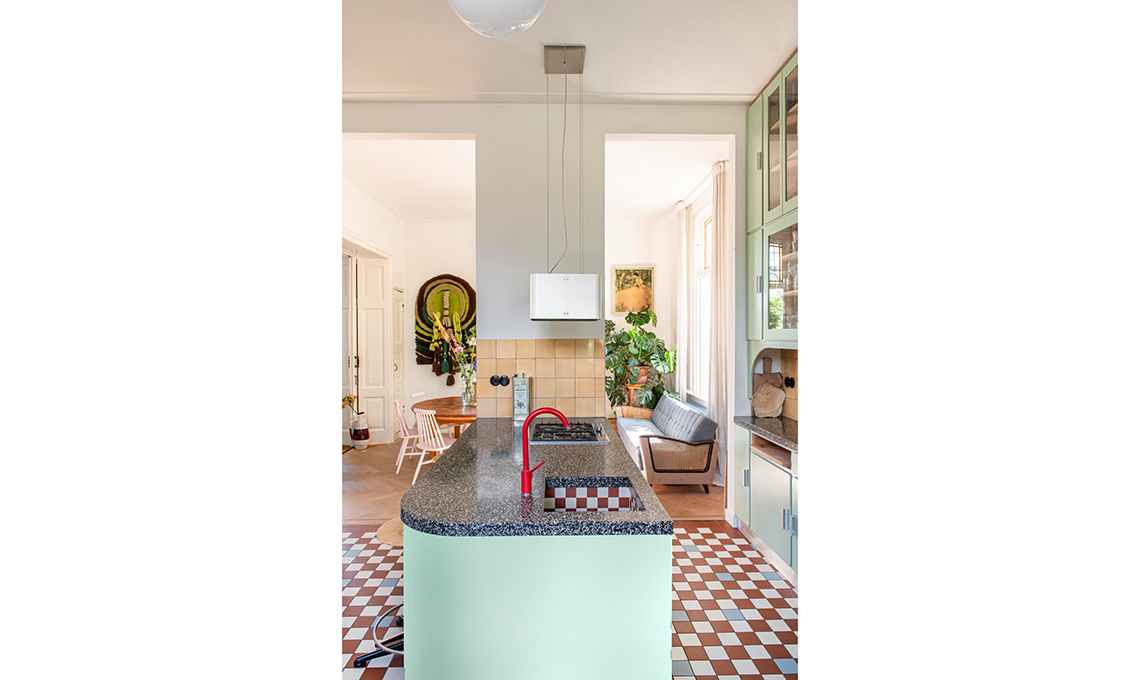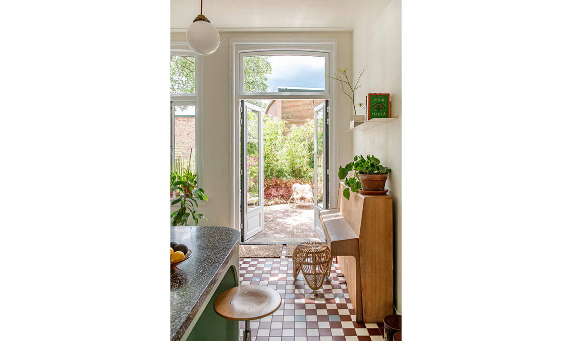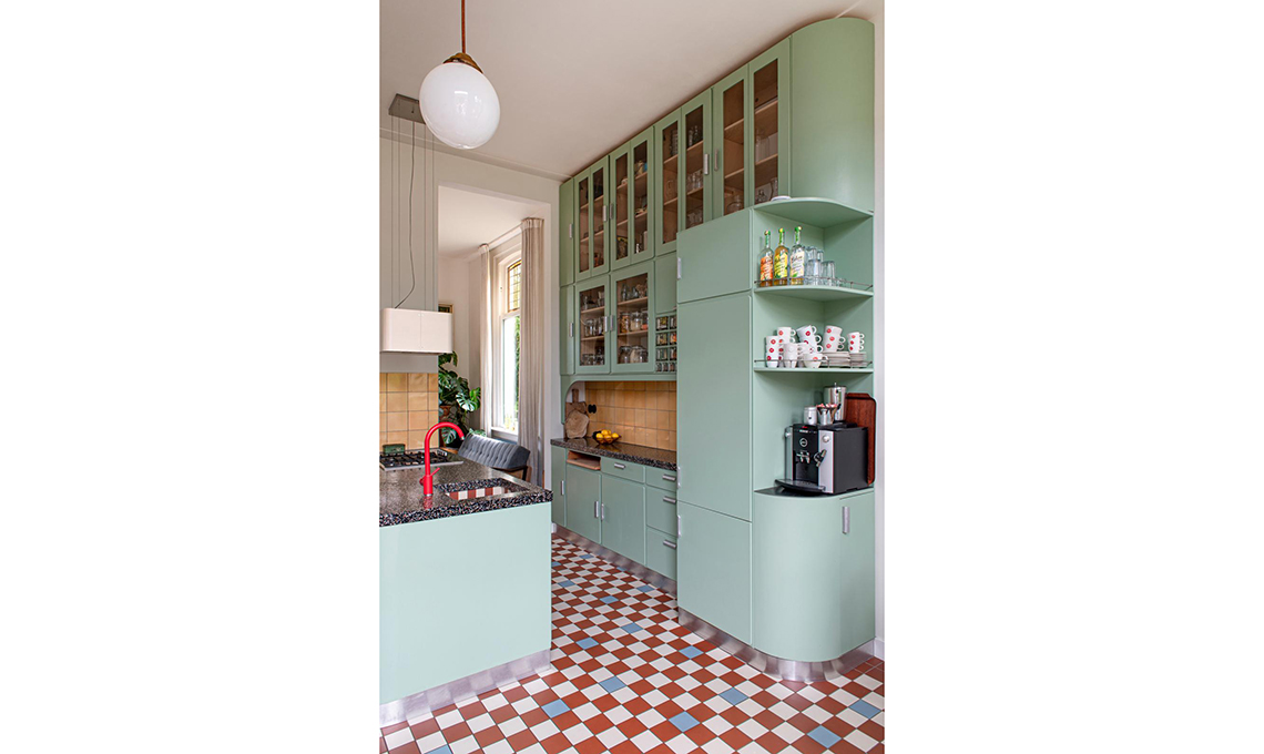 La cucina è stata completamente rivista con la ritrutturazione, anche l’apertura verso il pranzo è stata un’idea di Daan. «Per i mobili – racconta Jolein – abbiamo a lungo cercato il colore giusto. Volevamo un verde un po’ rétro, che si sposasse bene con le ante a vista e le forme arrotondate». Il pavimento a scacchi è la ciliegina sulla torta!