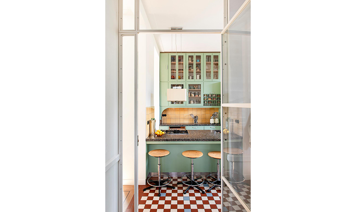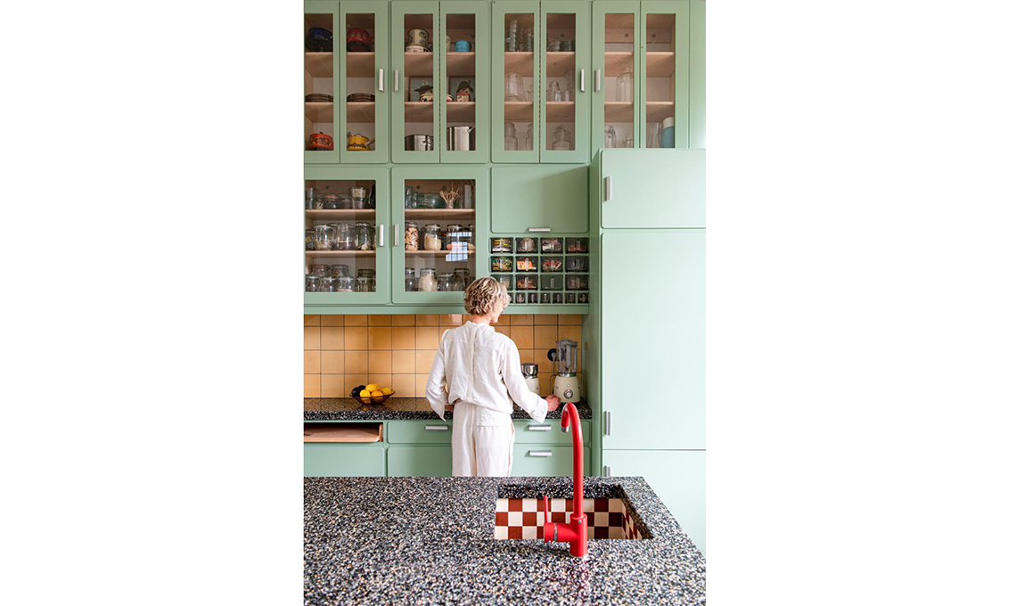 La cucina è un inno al vintage – dal pavimento a quadretti ai mobili verdi – come quasi tutti gli arredi della casa. E che chic le lampade a globo!