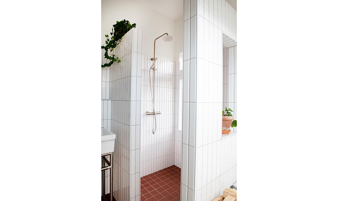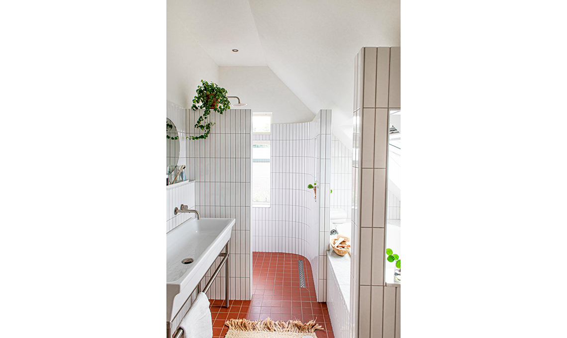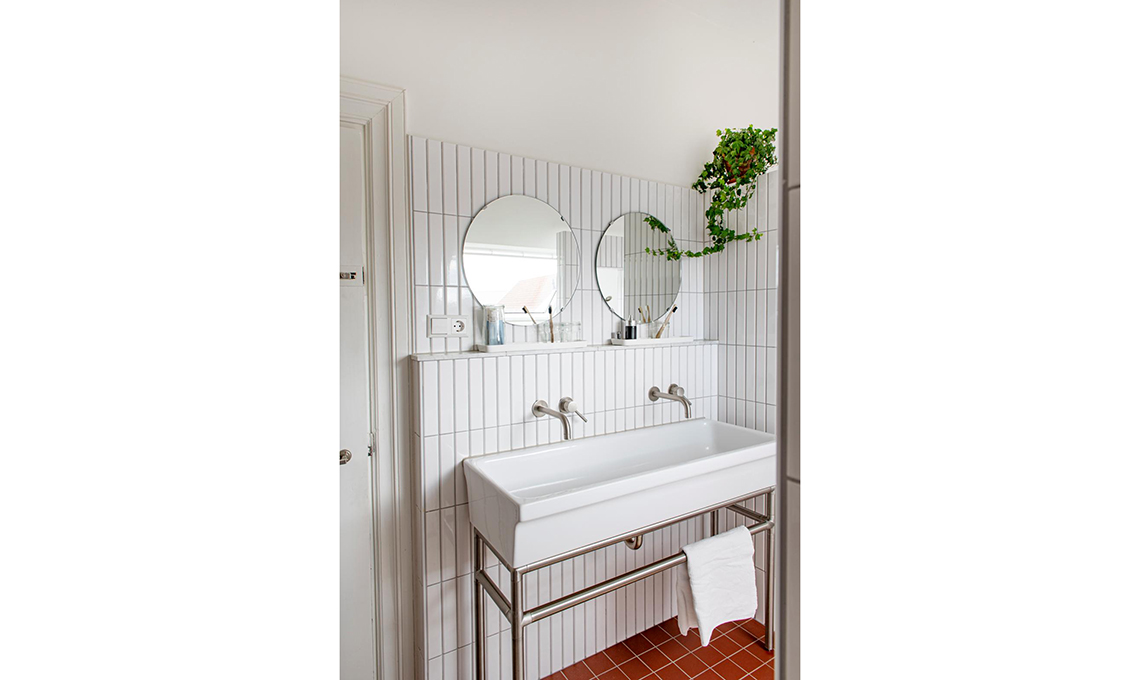 Il bagno, ridisegnato da Daan, è in linea con il mood vintage del resto della casa. Merito del tutto bianco unito alle piastrelle color cotto a pavimento e allo stile del lavabo, un modello ‘a canale’ come quelli che si vedevano un tempo nelle scuole.