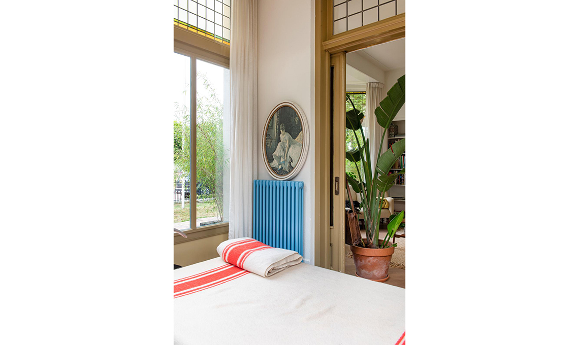 Per le pareti del living, colore bianco Ral 9010, tende [Ikea]. Il coffee-table e le poltrone sono pezzi Anni ’60 di Louis van Teeffelen (su siti specializzati di vintage: design-market.eu vntg.com e pamono. it. Il calorifero è Charleston di [Zehnder], acquistato di seconda mano online e dipinto di blu (Ral 5024). Vasi rossi tedeschi Anni ’60.