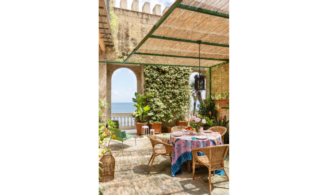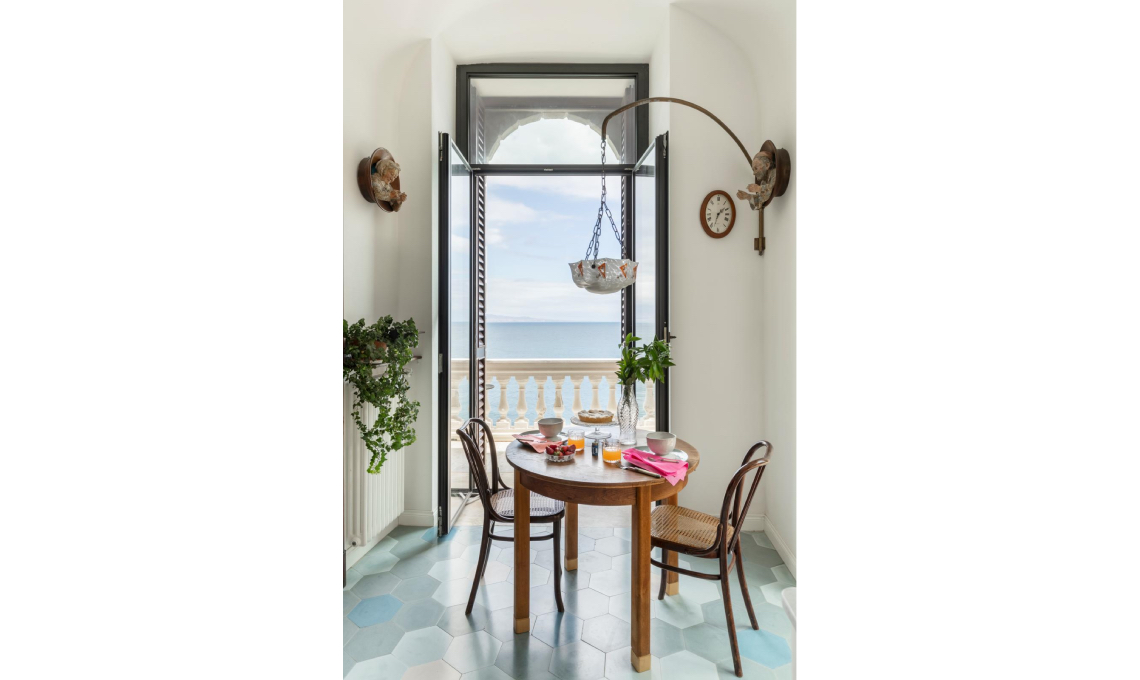 Sul balcone da cartolina c'è spazio per un tavolino dalle linee retrò per una seconda, veloce colazione. Il poggiapiedi diventa anche una base per una pianta a 'cascata'. Piatto e ciotola da [Lela], cuscino [Lisa Corti Home Textile].