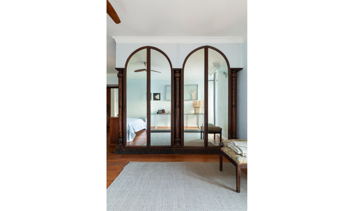 La forte personalità dell’armadio di famiglia con le doppie ante a specchio e le colonne intarsiate si alleggerisce con la veletta in cartongesso in cui è ‘incastonato’.