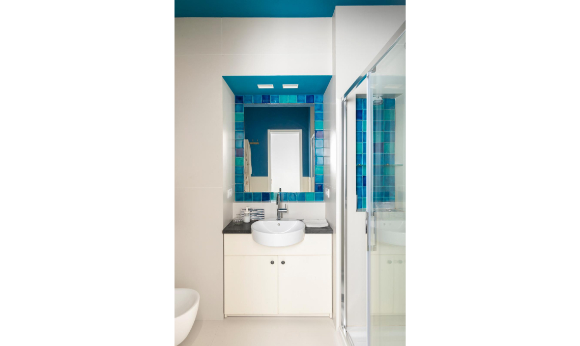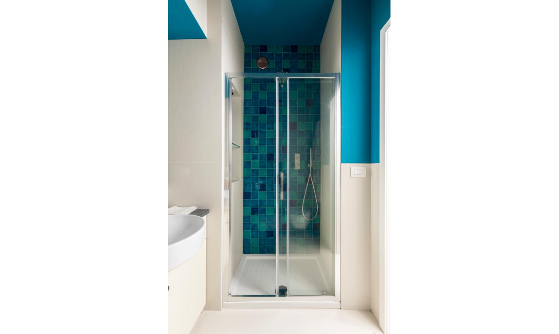 Il colore azzurro – anzi, acquamarina, un richiamo alla tradizione delle maioliche smaltate su terracotta tipiche della costiera Amalfitana – è la nota dominante di questo bagno. Sulla parete del lavabo e della doccia, piastrelle della serie Smaltato Colorato [Cottovietri], ma guarda anche le serie Pennellati e Trasparenze per un effetto leggermente diverso.