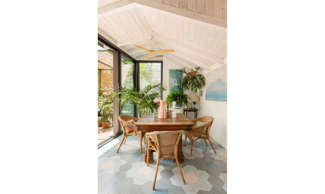 La zona giorno si apre letteralmente verso lo spazio outdoor. Un grande tappeto delimita la zona relax-pranzo. Seduta intrecciata Telar [Paola Lenti da Via Manzoni 82, Napoli], lanterne Eterea bianche [Platek], lanterna in vimini [L’ora del tè Home & Garden], tappeto Coconutrug Terra Fresca [GT Design].
