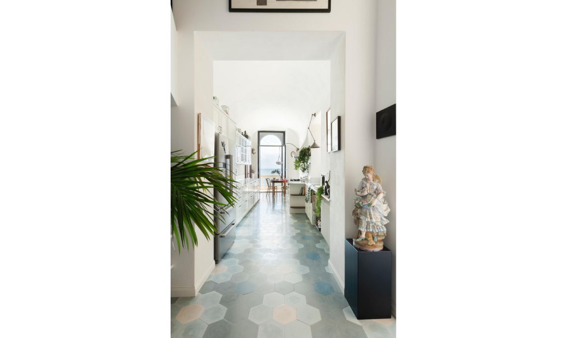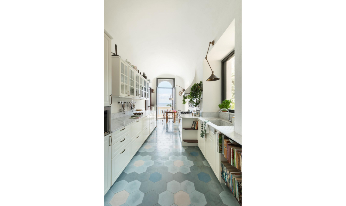 Sviluppata in lunghezza, con il soffitto a volta, la cucina si protende verso il balconcino e, più in là, sul mare. E i pezzi antichi – le terrecotte austriache a parete, la lampada appesa Art Nouveau, la ceramica di Capodimonte – sono perfettamente integrati. Le cementine [Tomasello] sono per natura porose, lavale usando