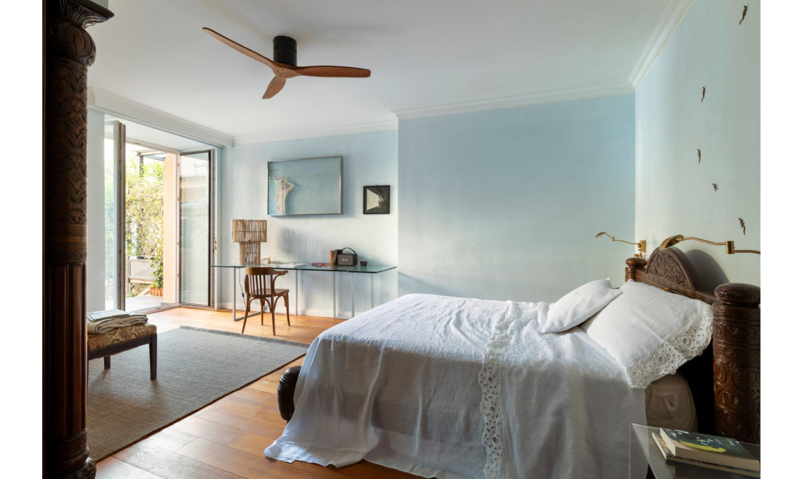 Nella camera padronale, le cementine lasciano il posto a un caldo parquet in teak. E l’azzurro si trasferisce dai pavimenti alle pareti: sono trattate con un intonachino a calce passato a frattazzo, dalla leggera irregolarità che conserva un sapore di autenticità e naturalezza. Letto e armadio di famiglia dallo stile orientale sono gli elementi a sorpresa che offrono un twist eclettico. Tappeto Coconutrug Terra Fresca [GT Design]. Sul letto, lenzuola [Fabbrica del lino]. Ventilatore Wind Calm su [» create-store.com].