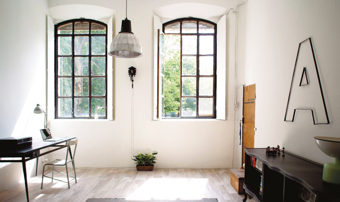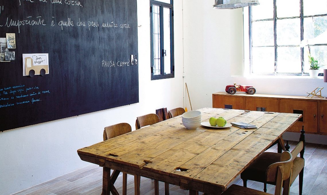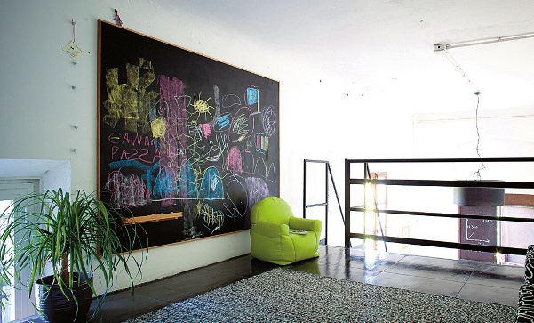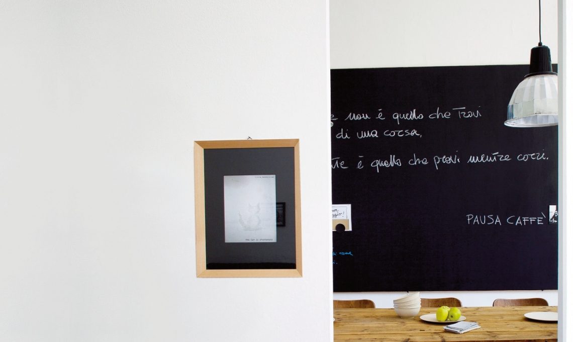 Quale mente creativa non sogna di avere a disposizione un’oasi di tranquillità come questa?! Qui si gioca di recupero duro e puro: il tavolone, da riunione o da cena con amici, nella sua vita precedente era il pianale di un carro da mercato! «La lavagna esagerata -dice Francesca- è vitale per noi, abbiamo sempre necessità di circondarci di appunti, ispirazioni e scritte varie».