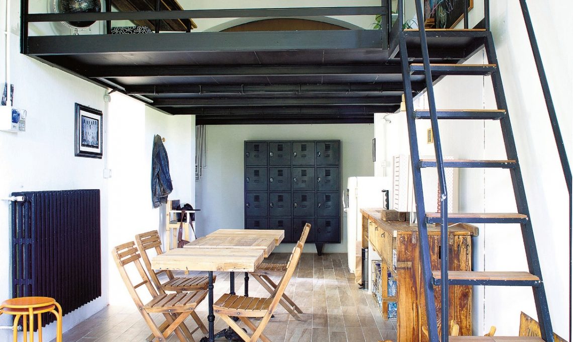 Il soppalco in ferro fa l’effetto di un ponte. Lo stanzone è grande, e lo spazio in alto è perfetto per concentrarsi. Il soffitto ribassato crea un’atmosfera raccolta anche nel passaggio pranzo; qui, tre basi in ghisa da bistrot, con piani in legno di recupero, fanno da tavolo modulare. Il calorifero era ‘anonimo’ ma, riverniciato di nero, contribuisce -con l’armadietto da palestra sul fondo- al giusto equilibrio di forme e colori materici