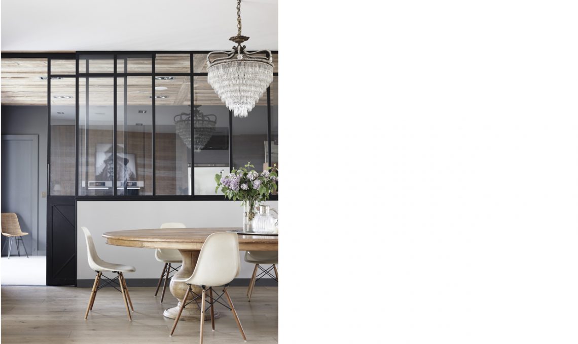 La vista sulla cucina è schermata dalla parete di ferro e vetro ideata da Cécile: lo chandelier si riflette e... raddoppia, come anche la grande foto di un maestoso leone. Le sedute sono le celeberrime DSW degli Eames [Vitra €384].