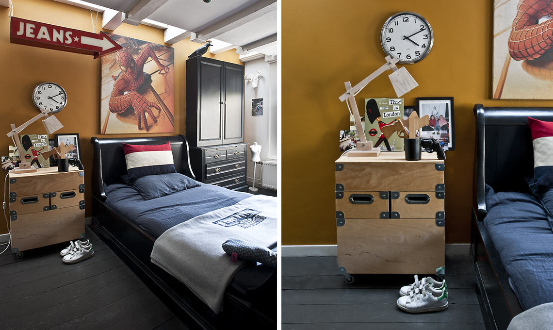 E per la camera dei ragazzi adolescenti? I mobili classici sono stati rivisitati con vernice e pennello e tinti di nero prendendo subito un'allure moderna e adatta a dei ragazzi. Una spruzzata di iconografia pop che occhieggia su poster e insegne dà il tocco ironico alla stanza, semplice e di carattere.