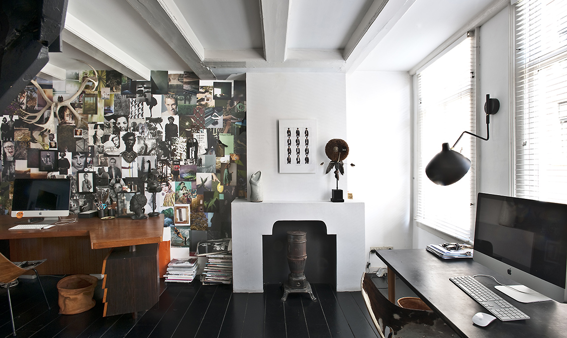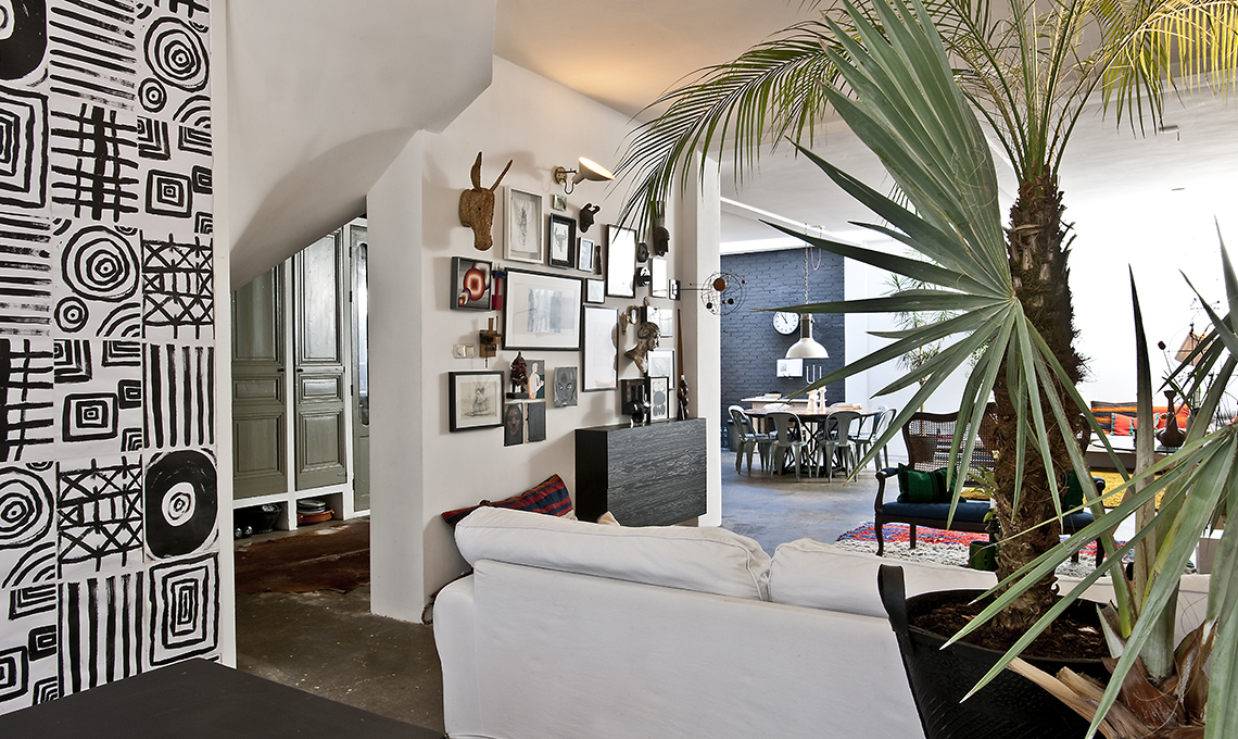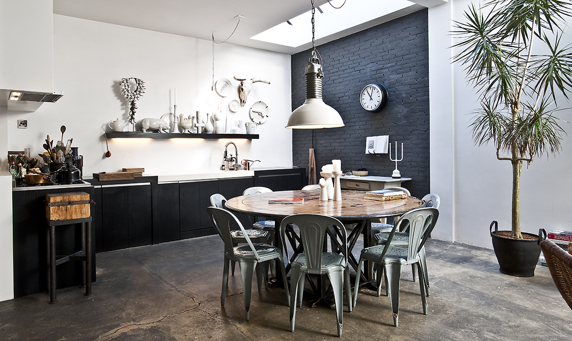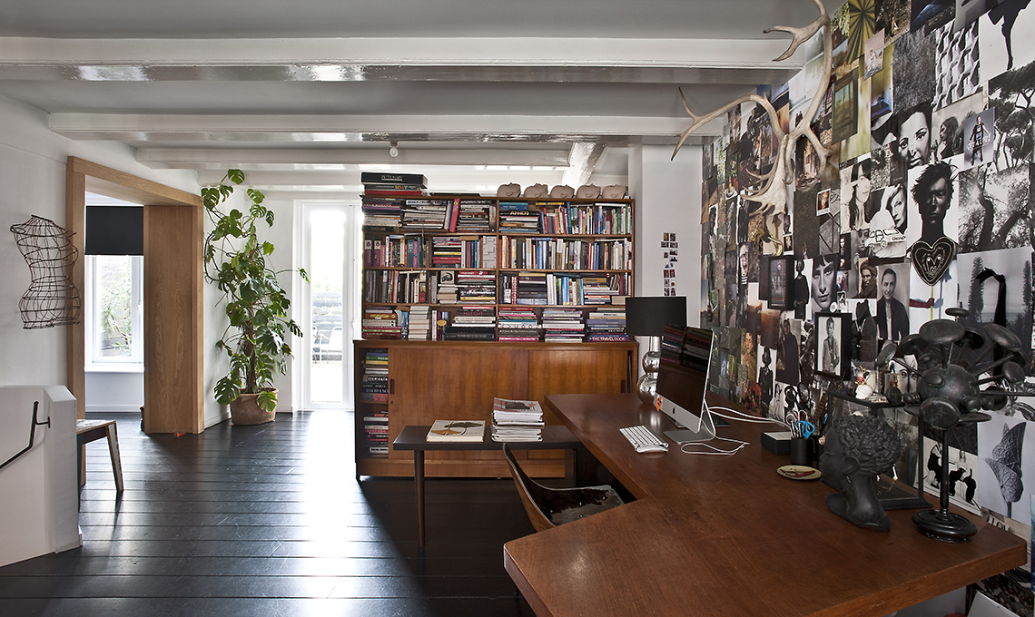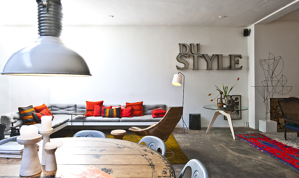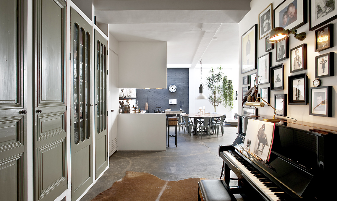 Un appartamento olandese con pavimenti scuri in legno e cemento reso accogliente e vissuto da tocchi etnici e arredi vintage