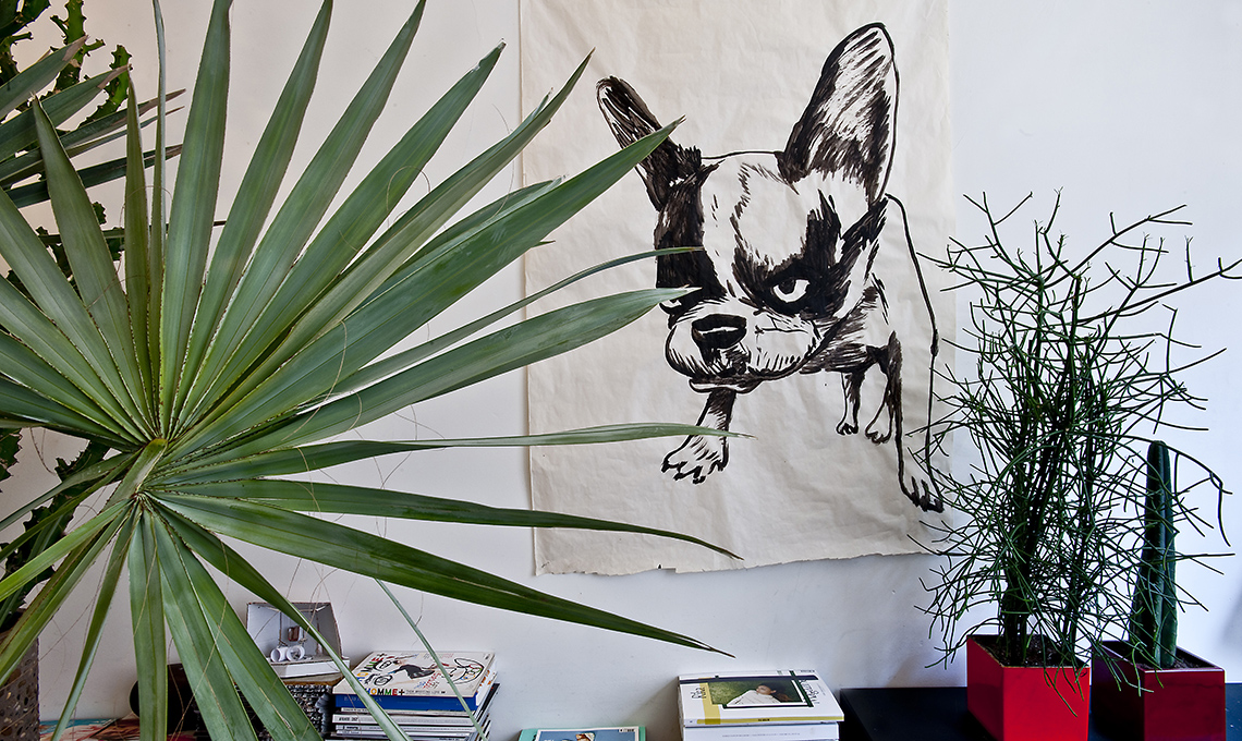 La parete in mattoni verniciati e l’area cottura a ‘L’ sono come una cornice che abbraccia la zona giorno. Puoi ispirarti a quest’idea anche in un ambiente mini, aggiungendo dei pensili. Se ti piacciono gli oggetti in ceramica sulla mensola, ne trovi di simili da [Seletti].