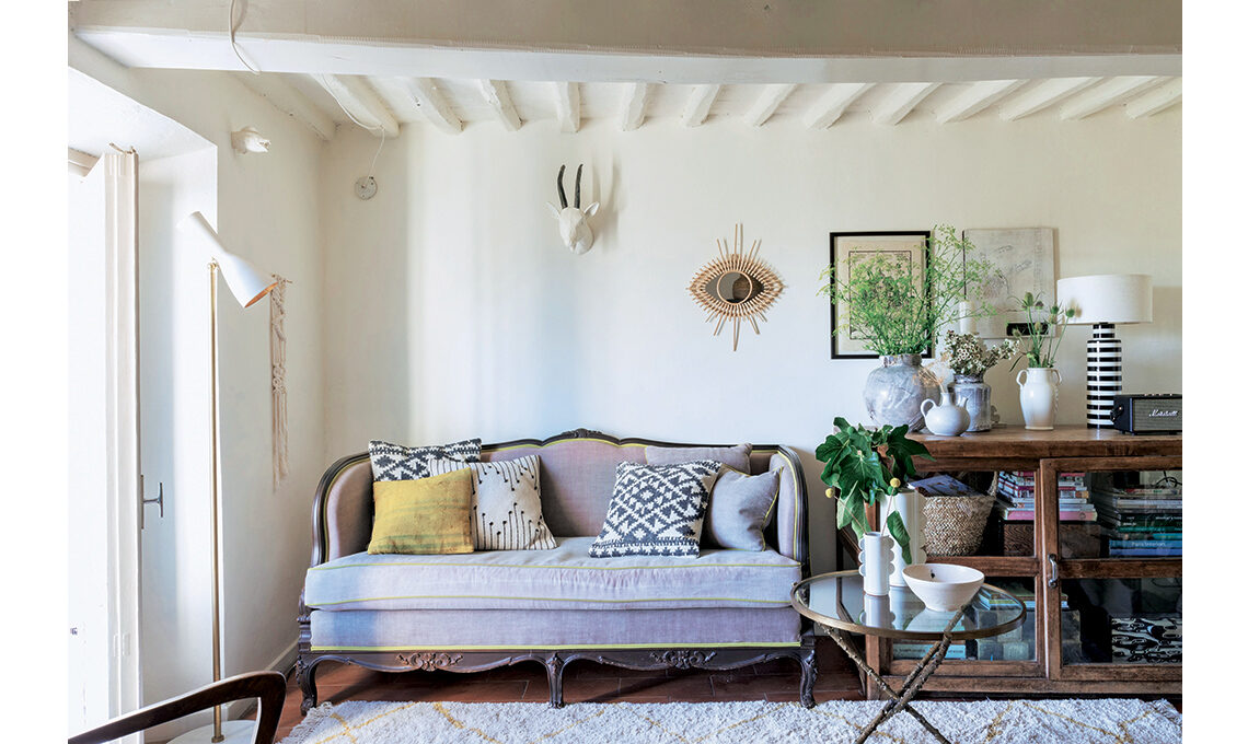 Home Collection su westwingnow.it €139], tavolino e lampada da terra Wormhole [Brass Brothers & Co.]. Specchio a forma di occhio [simile su amazon.it]. Cuscini [H&M Home].