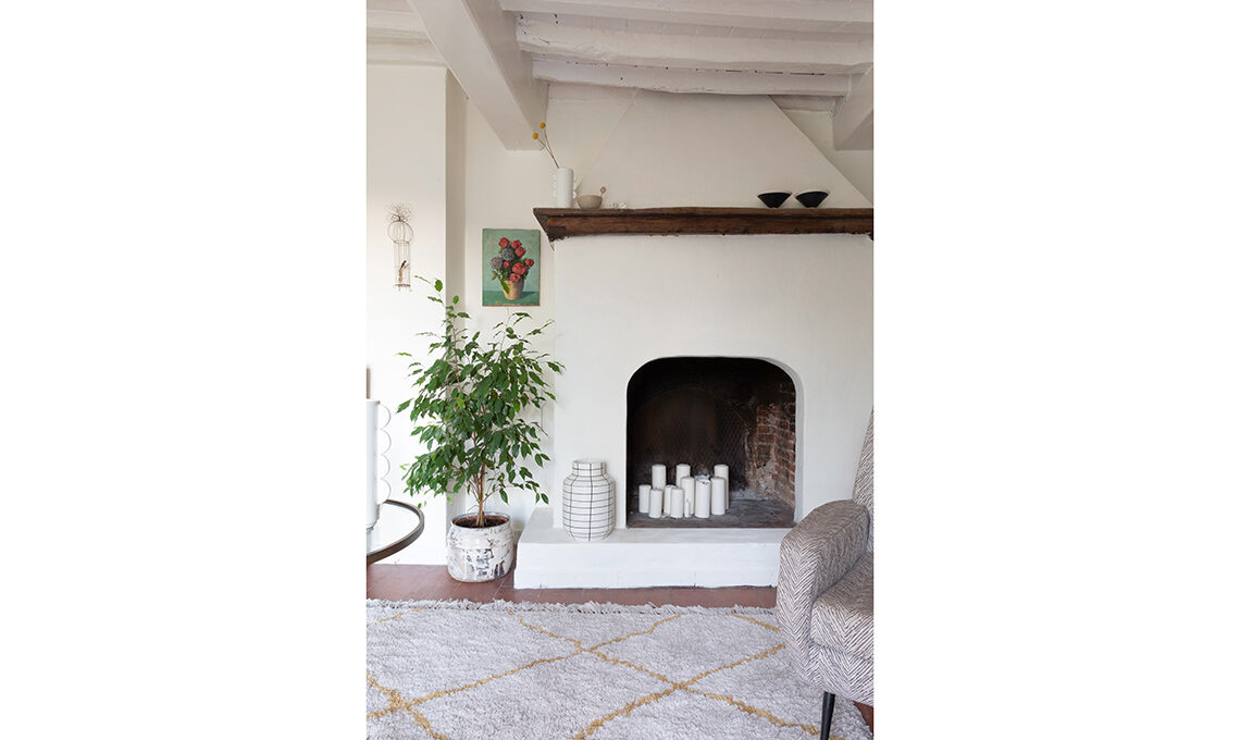 La mensola sopra il camino è stata realizzata con un’asse di recupero, carteggiata e trattata con un mordente. Il camino d’estate non