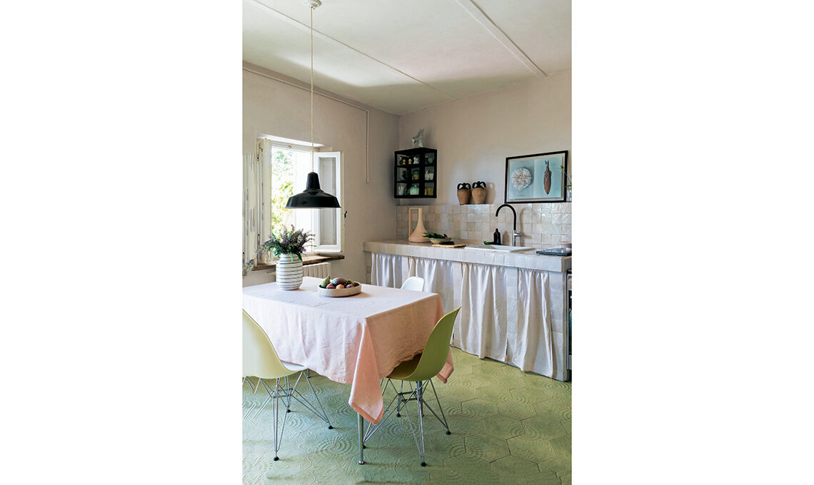 Nei rustici spesso le pareti sono irregolari. In questi casi un’ottima soluzione per la cucina è realizzarla in muratura: così si può ‘correggere’ qualsiasi imprecisione. Zellige del paraschizzi [Mosaic factory], sedie Eames Plastic Chair [Vitra].