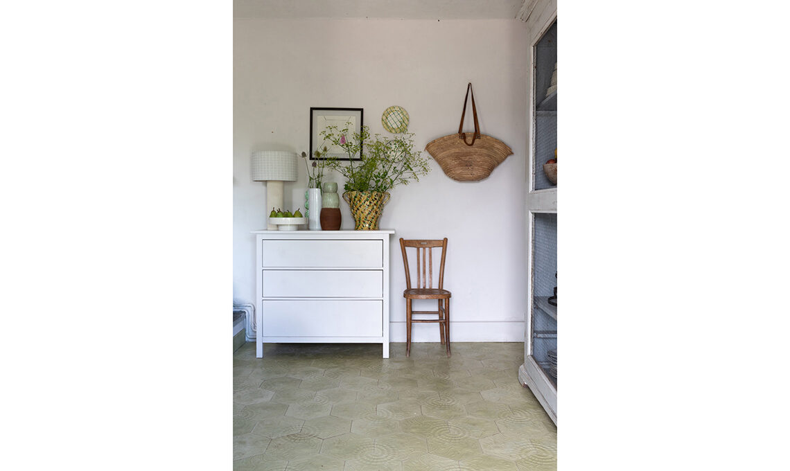 Pavimento a piastrelle esagonali [Viaplatten], tovaglia [H&M Home]. La credenza viene da un mercatino di Lucca.