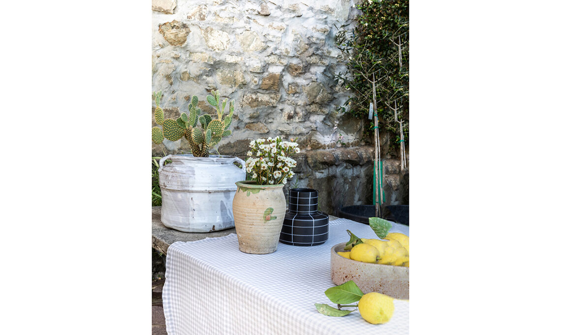 È disponibile in tanti colori (anche azzurro, corda, giallo senape e nero) la tovaglia a quadretti [su isolastore.it €34,99]. Sedie bianche in rattan e bambù come