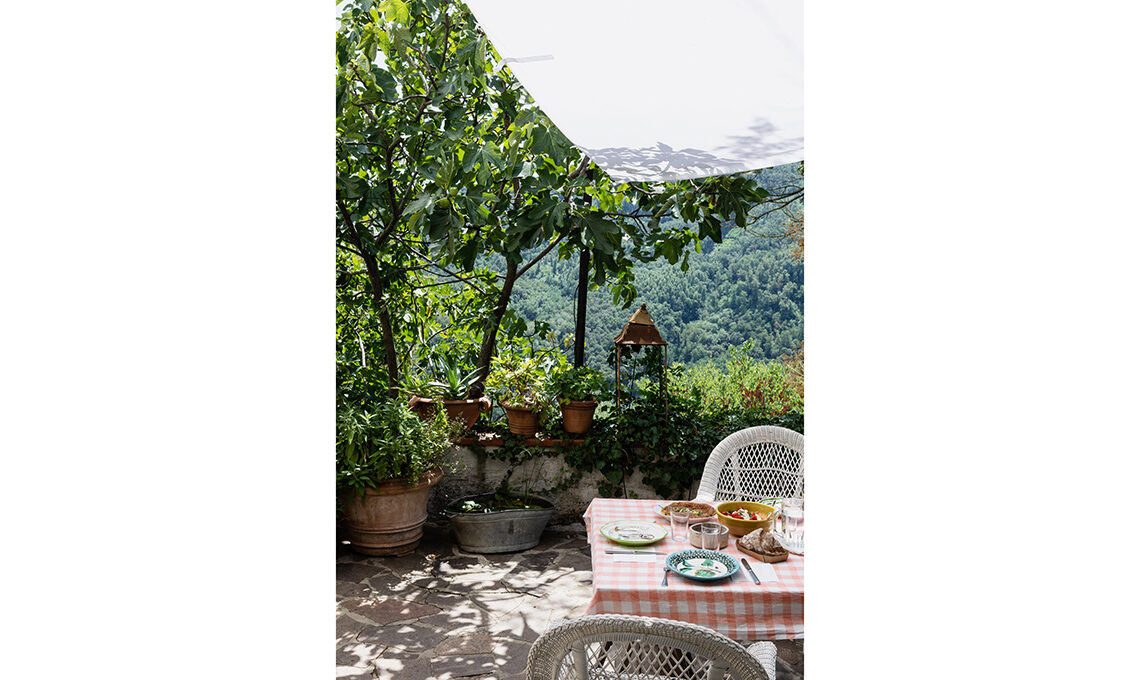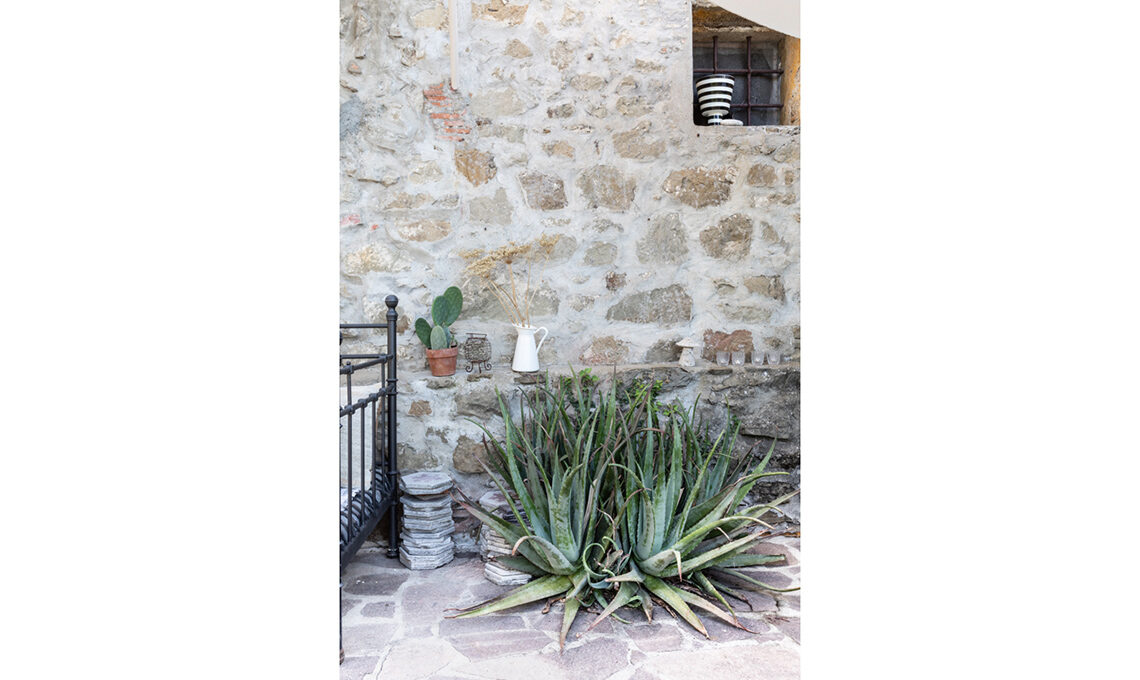 La casa in pietra ha due terrazze: una attrezzata con un grande tavolo dl sapore 'raw'.