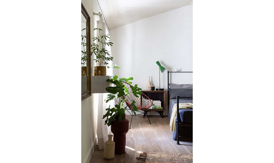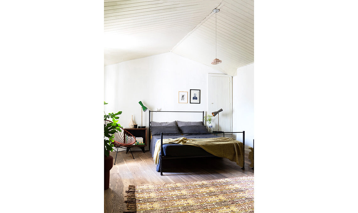 Letto in ferro realizzato da Britta, lenzuola di lino e plaid [Society Limonta], lampade da tavolo Wormhole [Brass Brothers & Co.], tappeto [Vossberg], poltrona New Acapulco [Sklum €56,99].