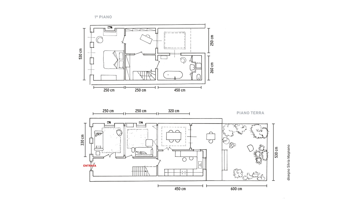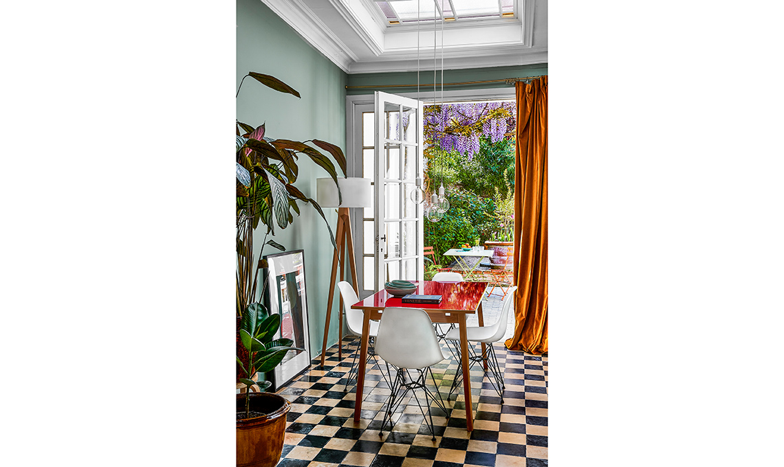 Il parquet di legno scuro, l’arco all’ingresso, la vasca in metallo, sono tutti elementi preesistenti che hanno deciso per il ‘nuovo’: la cucina, super minimal sulle cementine rétro, il quadro classico con i fenicotteri e poi quel verde che amplifica la magia del giardino d’inverno. Con il soffitto di vetro (originale) è il luogo ideale per le piante e per pranzare in mezzo al verde.