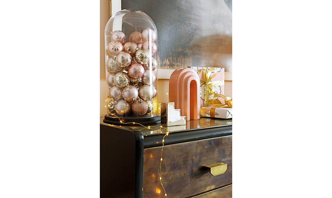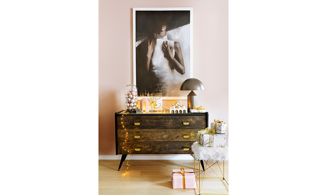 Sulla cassettiera vintage [da Vecchio Mio], campana in vetro su base in legno Eglantine [Maisons du Monde € 39,99] con decori [Croff - Upim], portacandela dorato Anteia e vaso rosa Andy [Kave Home € 5 e € 16].