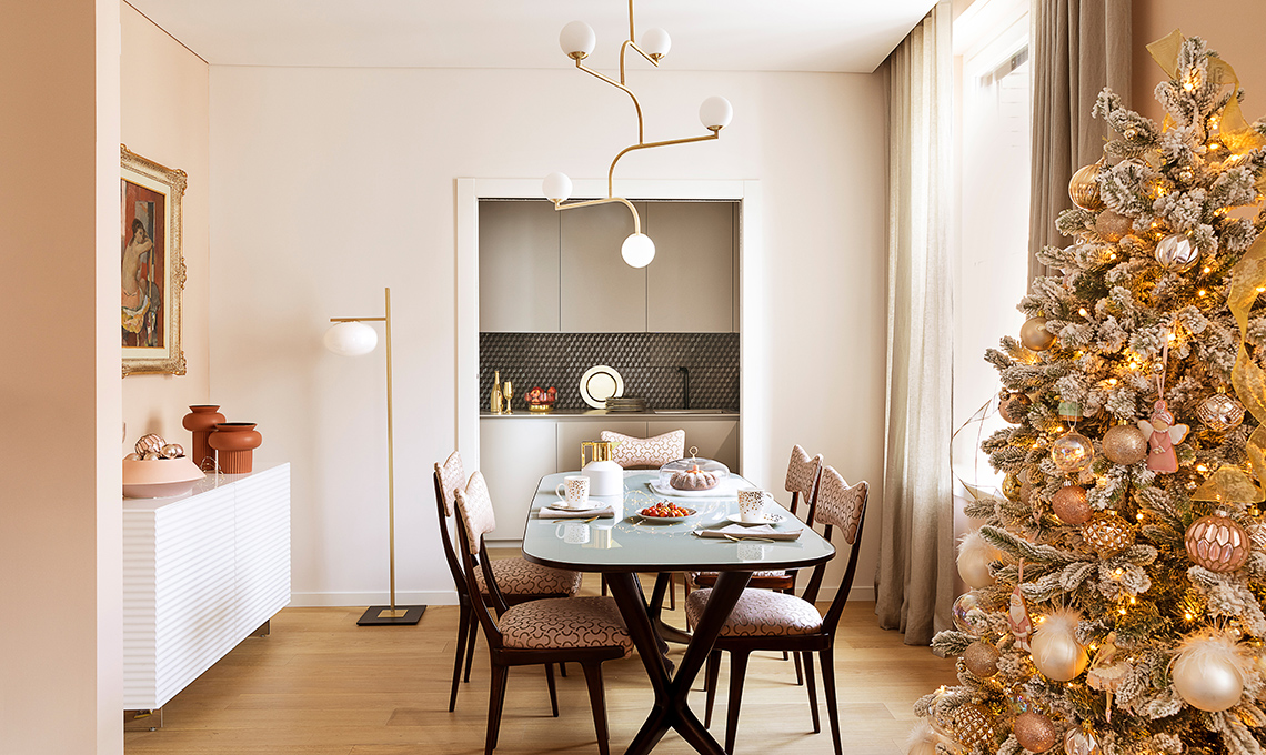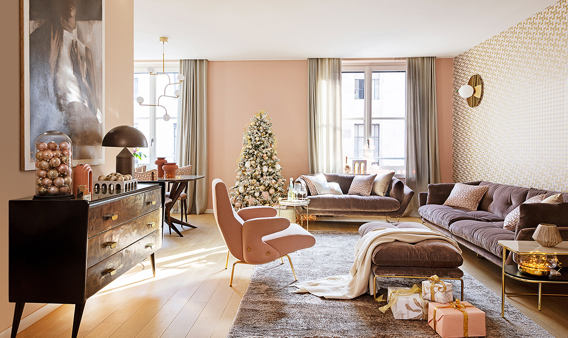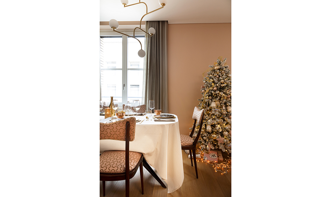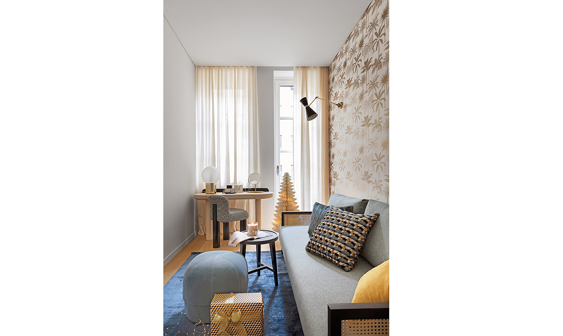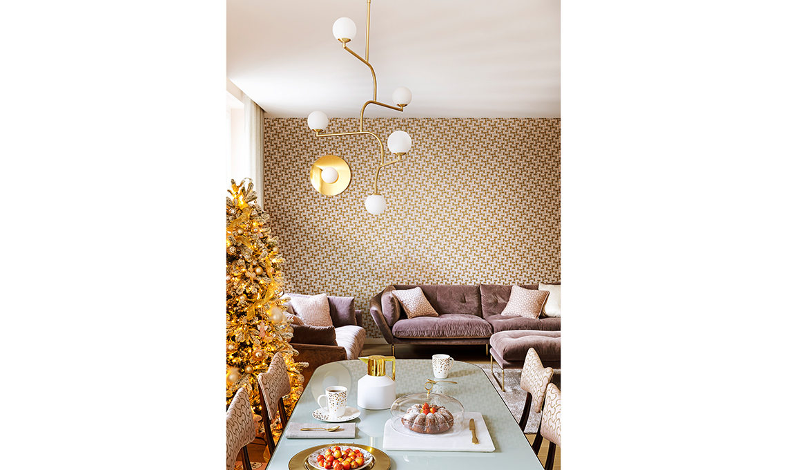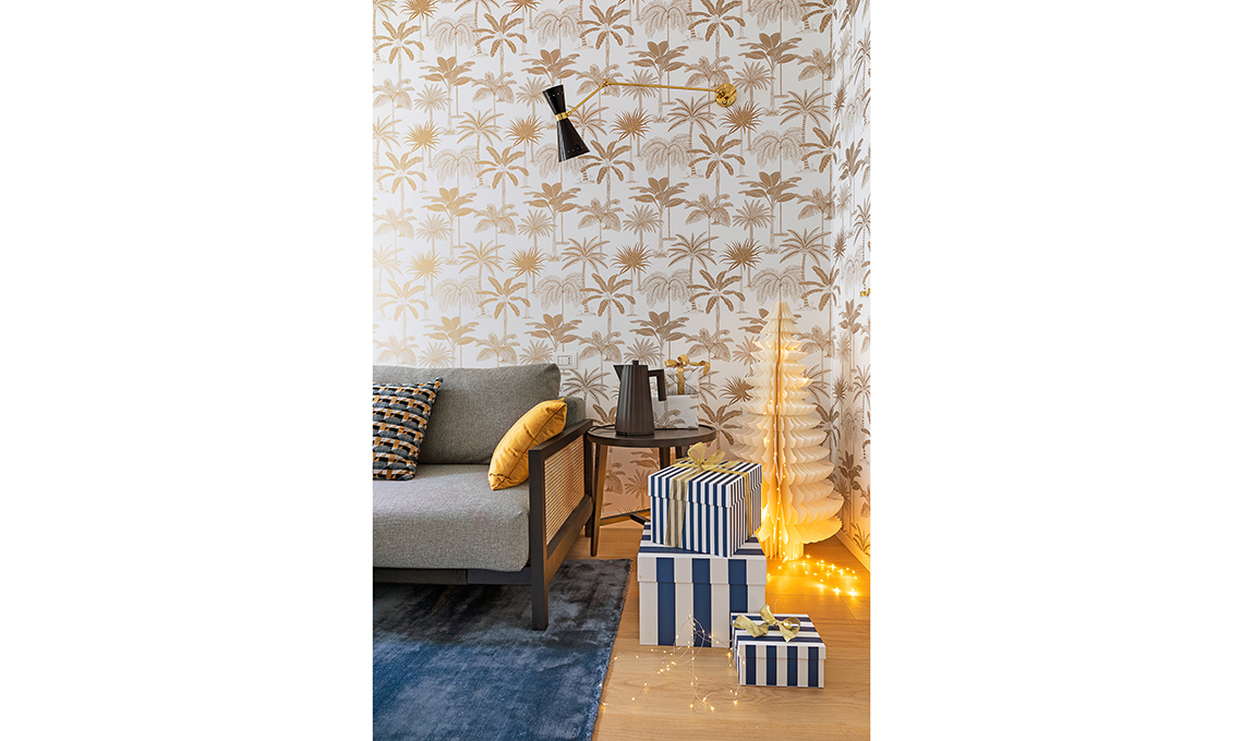 Può sembrare una scelta impegnativa, una carta da parati con l’oro. E invece è delicata, originale, preziosa ma al tempo stesso lieve. E insieme ai divani in velluto crea subito un effetto cocoon, indirizzando il colore delle decorazioni per il Natale.