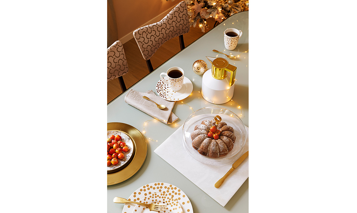 Sul tavolo comprato su [Subito.it]: sottopiatto dorato, piattini e tazze con pois oro [La Fabbrica del Verde], caraffa termica Geo [Normann Copenhagen