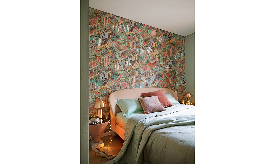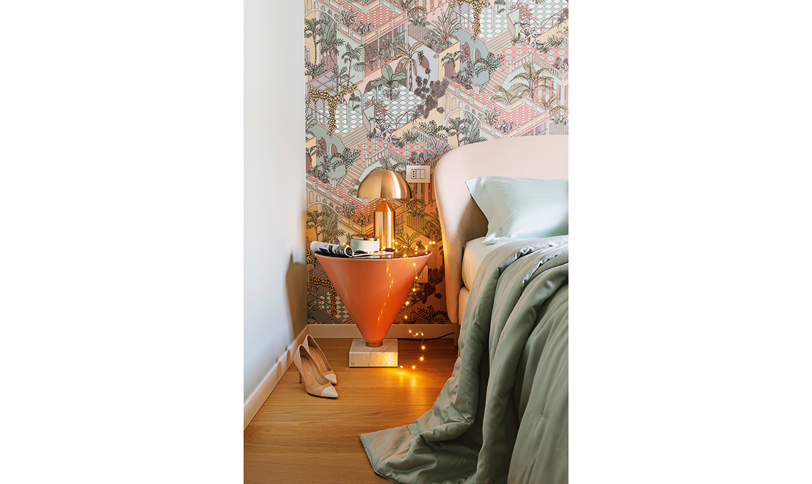 Dietro il letto Carnaby con piedini bianchi e rivestimento in velluto rosa cipria, completato da lenzuola in raso verde menta più trapuntino e cuscini d’arredo [tutto di Twils], c’è l’importante tappezzeria Miami [Cole&Son]; comodini Flute con base in marmo di Carrara e struttura a cono in metallo verniciato [Tonin Casa, ø cm 50 € 1.160] con scatola verde dal coperchio in ottone [La Fabbrica del Verde] e lampade Atollo Mini in ottone spazzolato [Oluce].