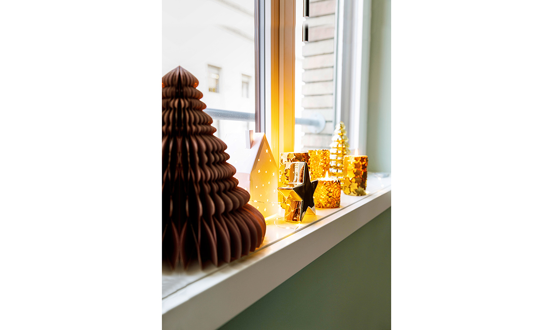 Alberi in carta, lanterna portacandele in ottone e casetta di carta con luci [La Fabbrica del Verde], decoro a forma di stella in ceramica oro [Maisons du Monde, cm 13h €4,99], candela oro e portacandela a forma di alberello [Upim]. pittura Green Blue 84 [Farrow & Ball].