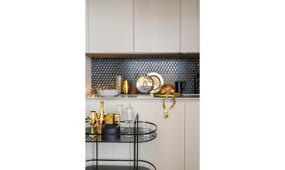 Sul carrello Chic [Bontempi], calici dorato [KnIndustrie] e in vetro [Vidivi da Upim]; sul top, piatto JM14 BR [Alessi] con panettone [Balocco], vaso geometrico [H&M Home], shaker e caffettiera [KnIndustrie].