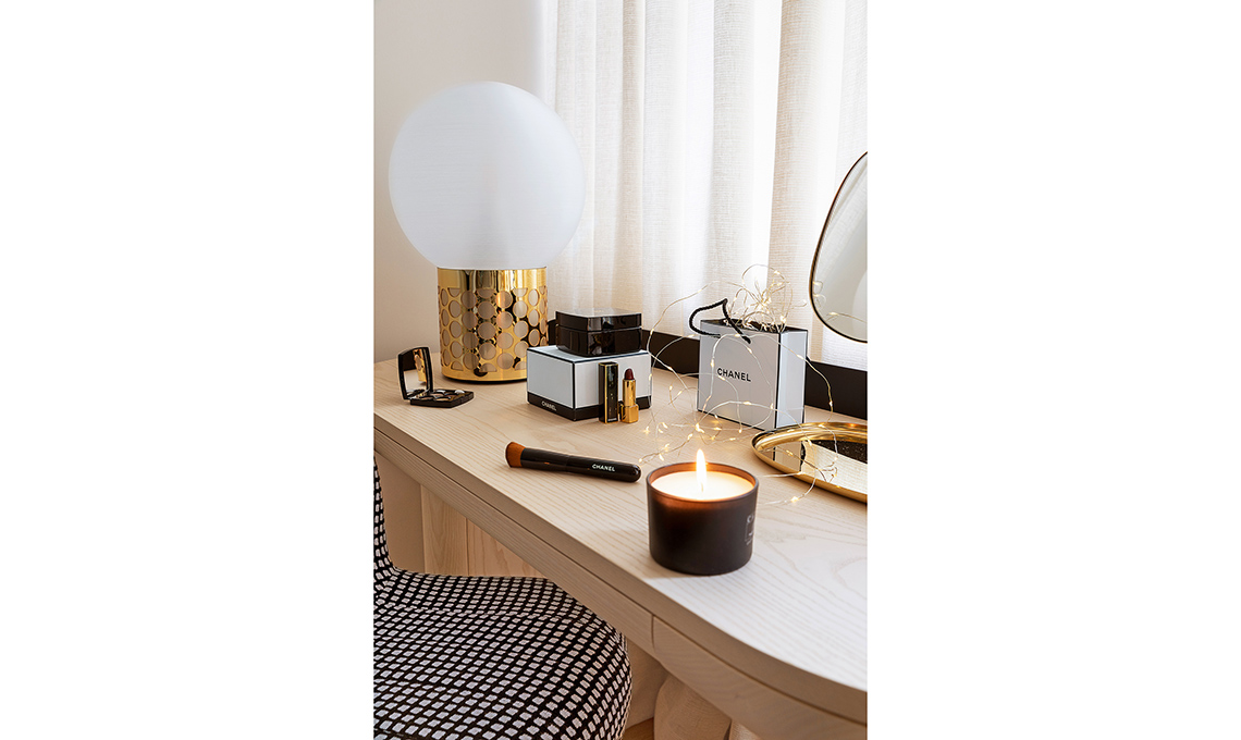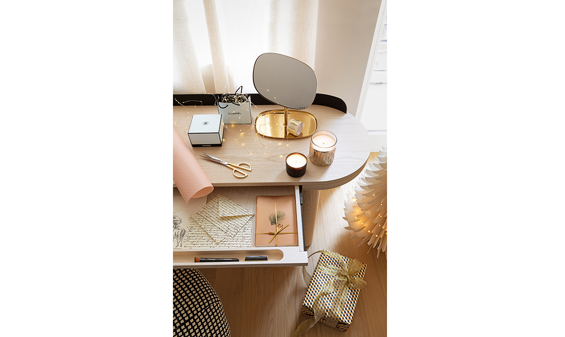 Sullo scrittoio Jumbo in frassino [Miniforms, cm 128x50x77h € 2.055], specchio Flip in ottone lucido [Normann Copenhagen € 160], lampada Atmosfera in metacrilato/Goldflex® [Slamp, ø cm 30x44,5h €320], candele profumate in vetro [Caleffi e Maisons du Monde], cosmetici [Chanel].