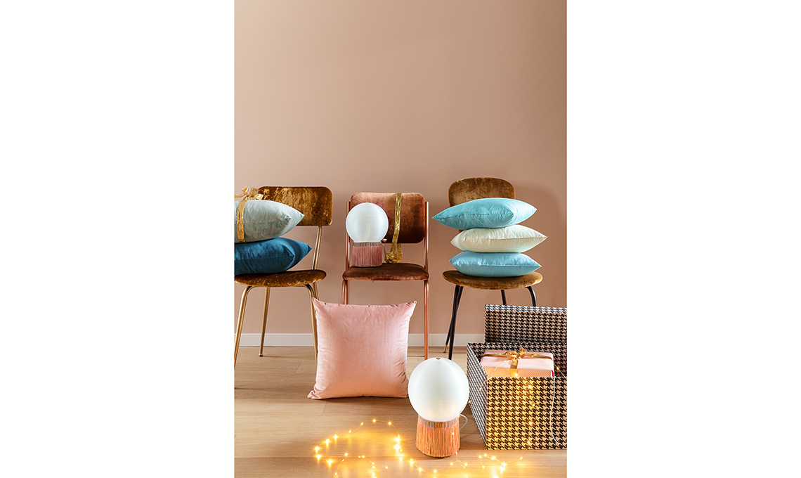 Sedie Miss Tina, Miss Ava e Miss Lola [Lalabonbon] con cuscini in velluto [Caleffi] e in piumino [Cinelli], lampade con frange Atmosfera Fringe [Slamp], scatole [Grafiche Tassotti].
