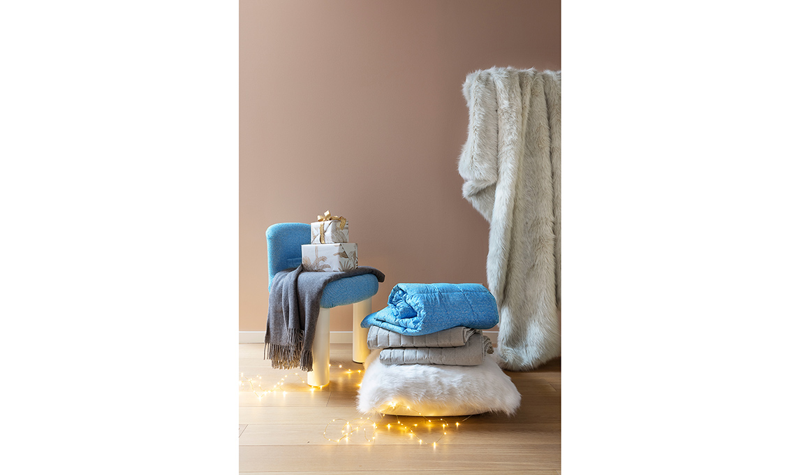 Sedia Botolo [Arflex], con plaid Pop in lana merino [Somma € 89,90], a terra cuscino Husky [Zinc € 415] con copriletto trapuntato Chromo [Gabel da € 74] e trapuntino azzurro [Cinelli]; plaid appeso Pernula in ecopelliccia [La Perla € 415].