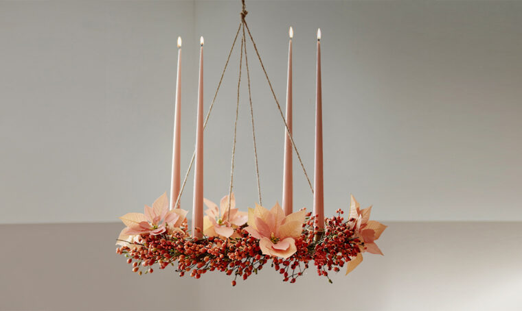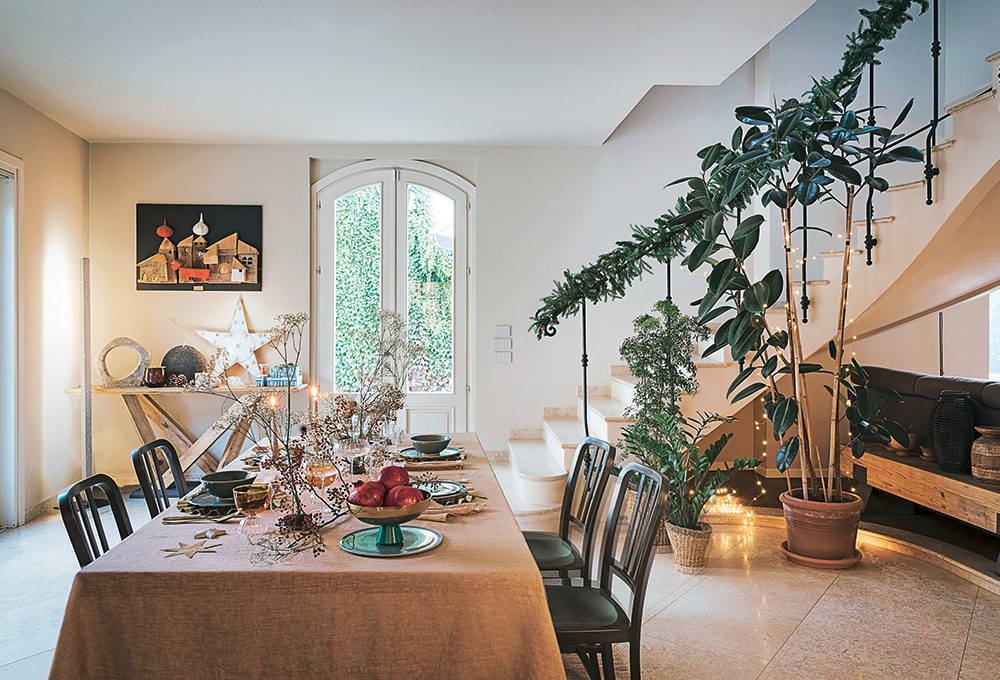 dal burro all’écru la stanza da letto padronale. Il tema del macramè rimbalza dalla coperta runner ai piedi del letto, alla scenografica lampada chandelier a cascata, fino alla tenda che incornicia il comò grigio perla. Soft i touch natalizi: un ramo di abete, i pinetti origami e il luccichio delle candele.