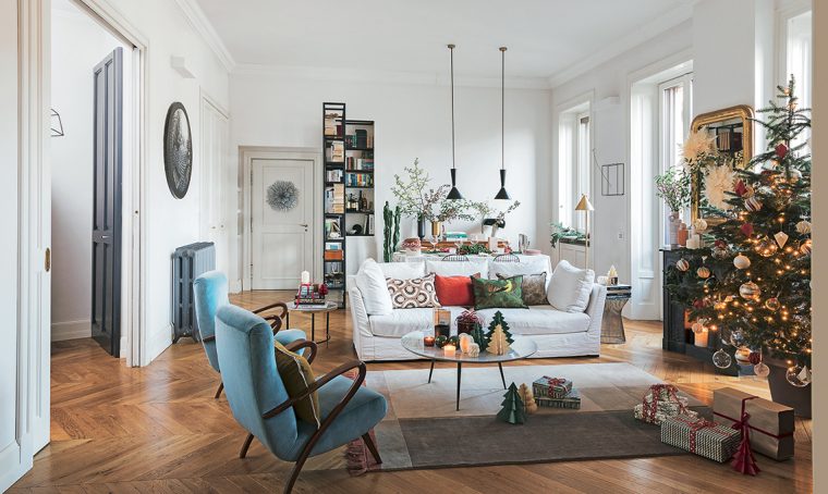 Gli addobbi più riusciti sono quelli che si inseriscono in casa senza stravolgerla. Qui, tra candele accese e l’albero addobbato, plaid e cuscini da sprimacciare regalano dolci momenti di calma.